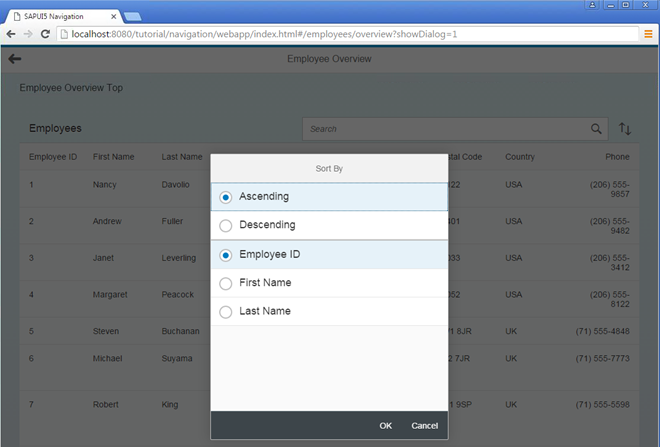 });Once again we will update the EmployeeOverviewContent controller to add support for the bookmarking of our sorting dialog. We decide to choose a query parameter showDialog that controls if the dialog is opened directly when we navigate to the page with a deep link. Therefore, we extend the matched event handler for the employeeOverview route. If the query parameter showDialog is set to 1 (note the implicit conversion to a Boolean type for the check) we open the dialog. We only have to make sure that the dialog does not get closed again by the router as this behavior is the default when navigating. Therefore, we call oEvent.preventDefault() to tell the router that we want to keep the dialog open.