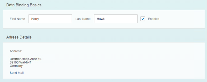 #!xml<mvc:View xmlns="sap.m" xmlns:l="sap.ui.layout" xmlns:mvc="sap.ui.core.mvc" controllerName="sap.ui.demo.db.controller.App"> <Panel headerText="{i18n>panel1HeaderText}" class="sapUiResponsiveMargin" width="auto"> <content> <Label text="{i18n>firstName}" class="sapUiSmallMargin" /> <Input value="{/firstName}" valueLiveUpdate="true" width="200px" enabled="{/enabled}" /> <Label text="{i18n>lastName}" class="sapUiSmallMargin" /> <Input value="{/lastName}" valueLiveUpdate="true" width="200px" enabled="{/enabled}" /> <CheckBox selected="{/enabled}" text="{i18n>enabled}" /> </content> </Panel> <Panel headerText="{i18n>panel2HeaderText}" class="sapUiResponsiveMargin" width="auto"> <content> <l:VerticalLayout> <Label class="sapUiSmallMargin" text="{i18n>address}:" /> <Text class="sapUiSmallMarginBegin sapUiSmallMarginBottom" text="{/address/street}\n{/address/zip} {/address/city}\n{/address/country}" width="200px" /> <Link class="sapUiSmallMarginBegin" href="{ parts: [ '/firstName', '/lastName' ], formatter: '.formatMail' }" text="{i18n>sendEmail}"/> </l:VerticalLayout> </content> </Panel> </mvc:View>