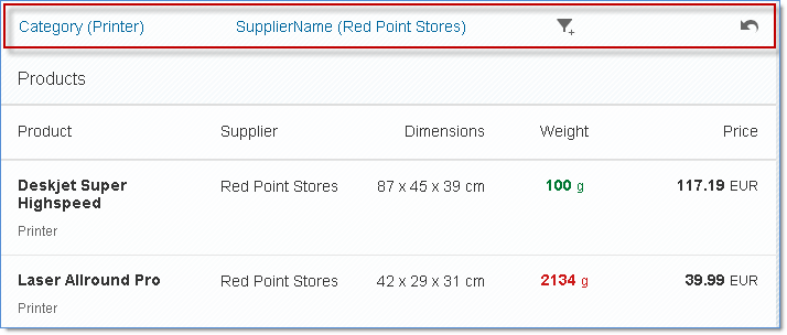 Your application displays a large list of products that can be grouped by category and supplier. With the facet filter, you allow users to dynamically filter the list so it only displays products from the categories and suppliers they want to see. In the following figure, the FacetFilter control is outlined in red and will be referred to as the 'toolbar' for the user. In the example, the user has set the following filters: