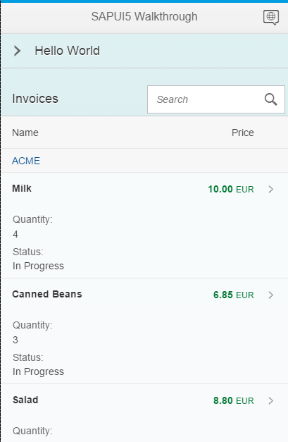 </mvc:View>We add two new properties expandable and expanded to the HelloPanel. The user can now close and open the panel to have more space for the table below on devices with small screens. The property expandable is bound to a model named device and the path /system/phone. So the panel can be expanded on phone devices only. The device model is filled with the sap.ui.Device API of OpenUI5 as we see further down. The expanded property controls the state of the panel and we use expression binding syntax to close it on phone devices and have the panel expanded on all other devices. The device API of OpenUI5 offers more functionality to detect various device-specific settings, please have a look at the documentation for more details.