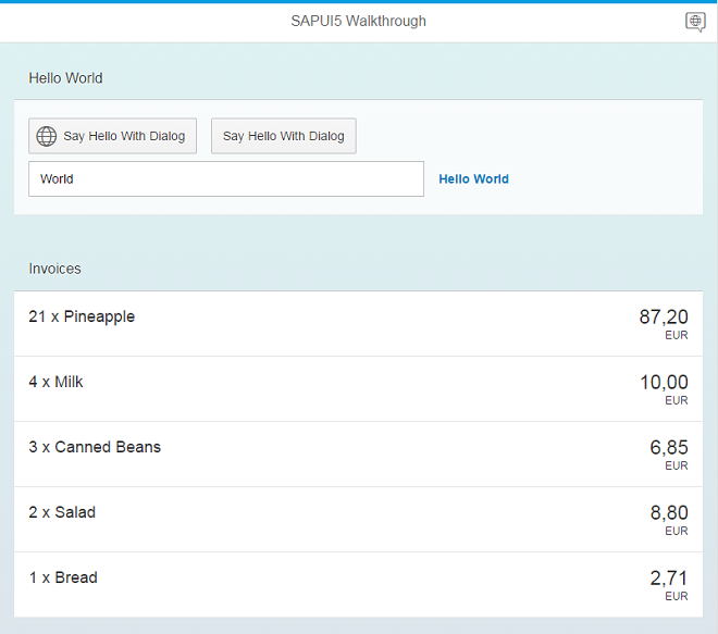 #!xml<mvc:View controllerName="sap.ui.demo.wt.controller.InvoiceList" xmlns="sap.m" xmlns:mvc="sap.ui.core.mvc"> <List headerText="{i18n>invoiceListTitle}" class="sapUiResponsiveMargin" width="auto" items="{invoice>/Invoices}"> <items> <ObjectListItem title="{invoice>Quantity} x {invoice>ProductName}" number="{ parts: [{path: 'invoice>ExtendedPrice'}, {path: 'view>/currency'}], type: 'sap.ui.model.type.Currency', formatOptions: { showMeasure: false } }" numberUnit="{view>/currency}"/> </items> </List> </mvc:View>