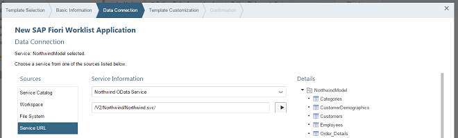 Under Service Information, choose Northwind OData Service and enter the URL /V2/Northwind/Northwind.svc/ .