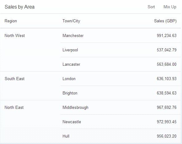 Here's a simple example of using mergeDuplicates. We'll set up a table of sales data, and display the data in a table, merging any duplicate regions. When the Mix Up button is pressed to lightly shuffle the salesFigures array of objects, you will see that only adjacent duplicates are merged. Press the Sort button again to see the ideal merging.