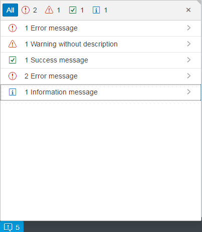 Message Popover is used to display a summarized list of different types of messages (errors, warnings, success and information). It provides a handy and systemized way to navigate and explore details for every message.