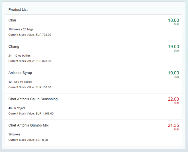 Expression binding allows you to display a value on the screen that has been calculated from values found in some model object. This way simple formatting or calculations can be inserted directly into the data binding string. In this example, we will change the color of the price depending on whether it is above or below some arbitrary threshold. The threshold value is also stored in the JSON model.