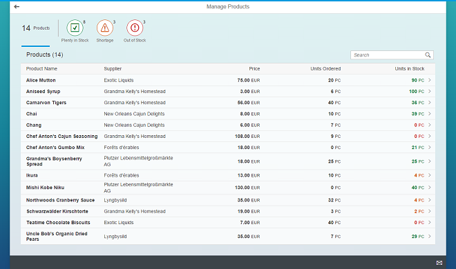 For easily detecting and managing product shortages in our app, we will add a quick filter for the worklist table. Users can press the filter tabs to display the products according to whether they are in stock, have low stock or no stock. The table will update accordingly and show only the products matching the criteria.