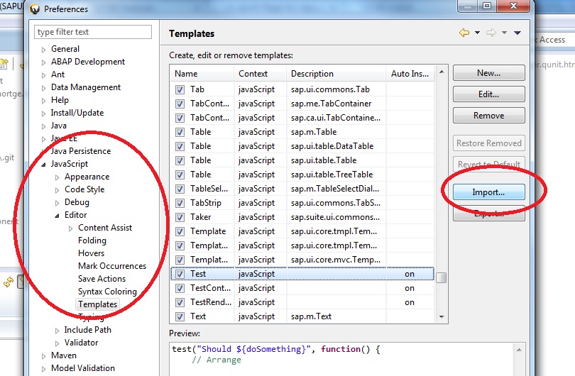 });If you are using eclipse, to import the templates start by calling up Preferences as shown below: