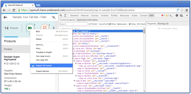 Additionally, you can right click on any OpenUI5 control from the app and select Inspect UI5 control. This automatically selects the control in the tree and you can review its properties directly.