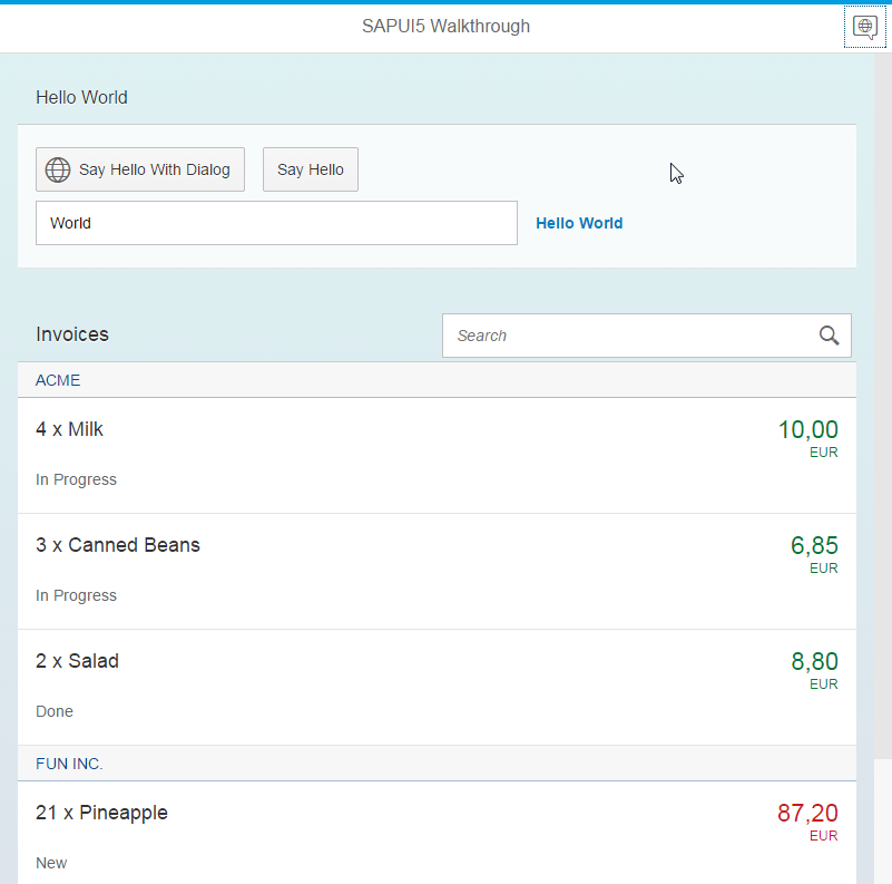 If no connection to the real service is available or the proxy configuration from the previous step does not work, you can always use the mockServer.html file. This will display the app with simulated test data. The index.html file will always load the data from a remote server. If the request fails, the list of invoices will stay empty.