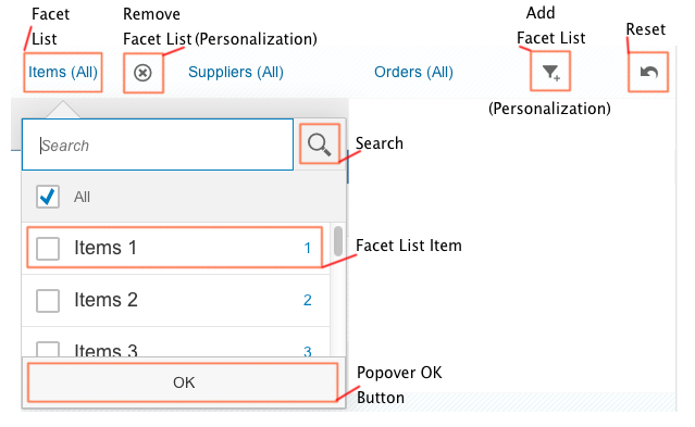 Your application displays a large list of products that can be grouped by category and supplier. With the facet filter, you allow users to dynamically filter the list so it only displays products from the categories and suppliers they want to see. In the following figure, the FacetFilter control is outlined in red and will be referred to as the 'toolbar' for the user. In the example, the user has set the following filters: