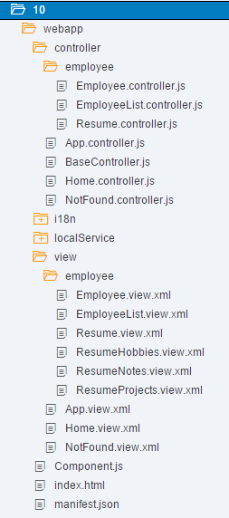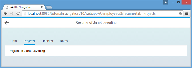 </mvc:View>Create the file ResumeNotes.view.xml in the webapp/view/employee folder similar to the Hobbies view to transform this tab to a separate view as well.