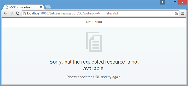Open the URL index.html/#/thisIsInvalid in your browser. From now on the user will see a nice Not Found page if a hash could not be matched to one of our routes.