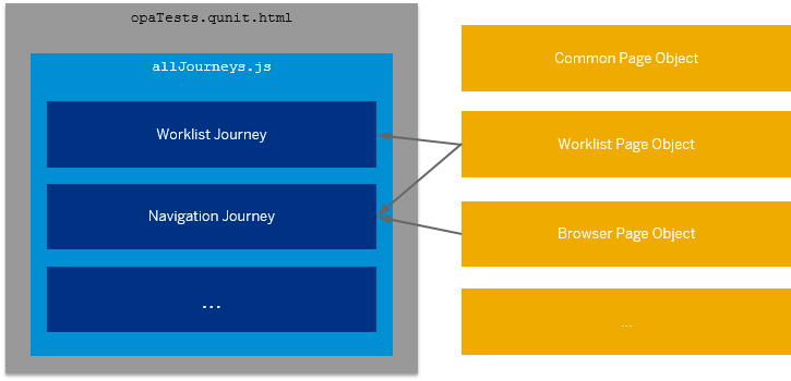 The journey uses another structuring element of OPA called “page object” that encapsulates arrangements, actions, assertions needed to describe the journey. Typically those are related to a view in the app but there can also be stand-alone pages for browsers or common functionality.