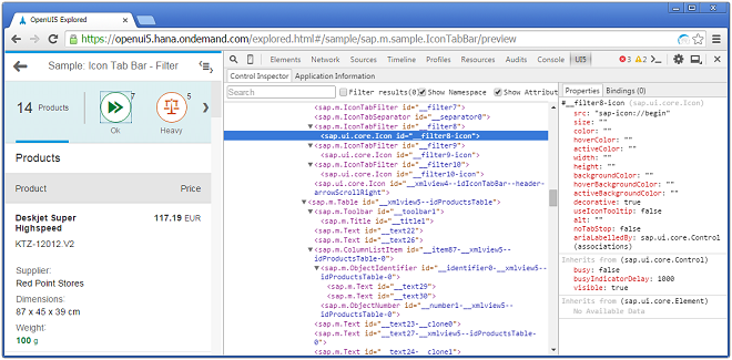 Inspect OpenUI5 controls and review their properties, bindings, and data model